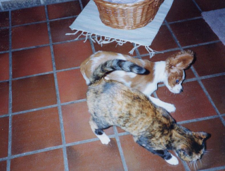 na 2 jaar kwam sasja bij ons wonen,die dacht katten leuk om achteraan te jagen.de oudste kat was al wat aan het demnteren die bleef genwoon staan.sasja had er geen lol aan dus dat was gelukkig meteen goed