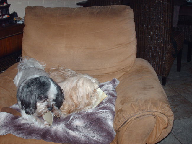 wat een mooie foto's en zo te zien liggen ze heerlijk te genieten. abby wil ook wel een cheewie en Sjenghi ook
