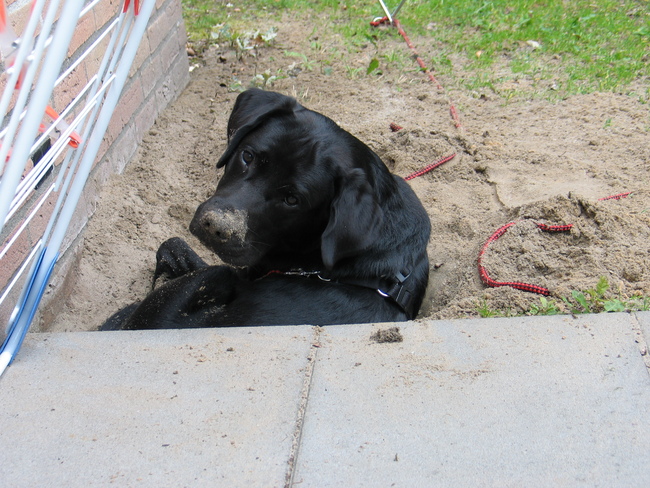 Enige wat ik me kan bedenken is dat Sibbe nooit alleen gelaten werd in de tuin zodat hij niet kon gaan graven. Ik ging alleen even een glaasje drinken halen.. en toen.. OEPS!!