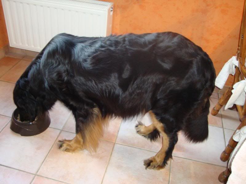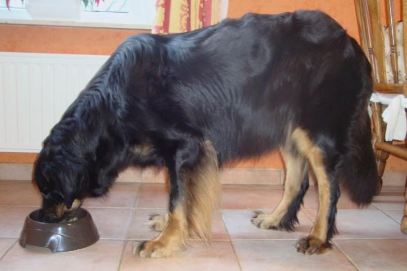 zo kreeg ik deze week al een lekker eitje bij mijn brokken, een beetje erwtjes en worteltjes en 's morgens enkele schijfjes banaan en een sneetje droog brood erbij. Ik krijg nu ook drie keer per dag te eten want de porties worden anders te groot ! Aan de omvang van mijn buikje is in ieder geval duidelijk