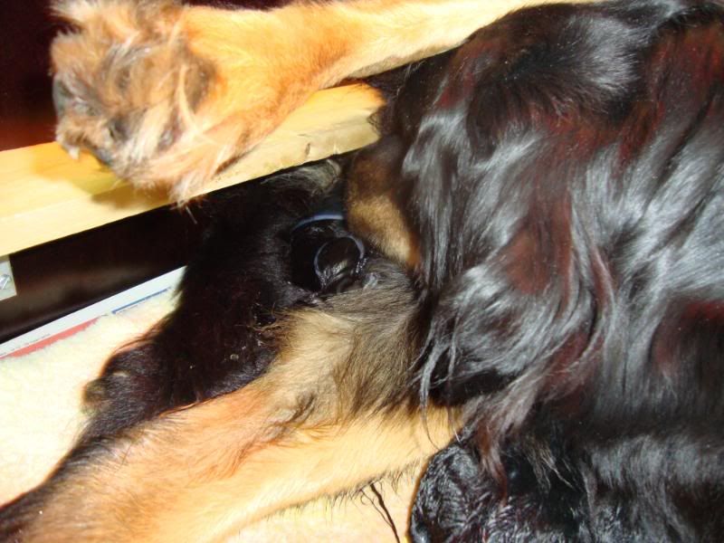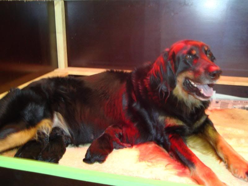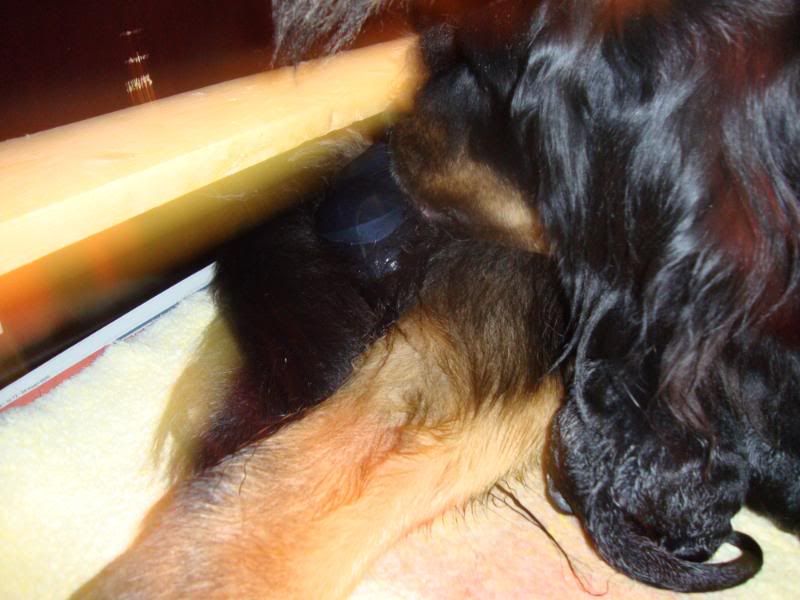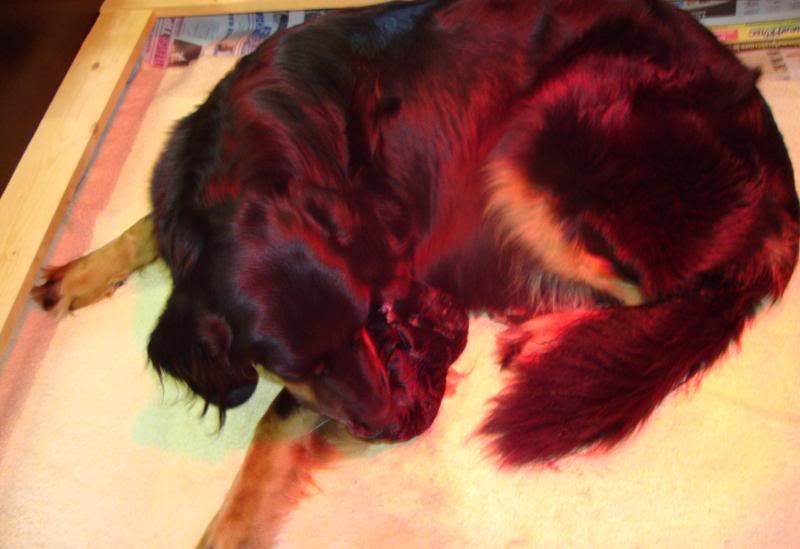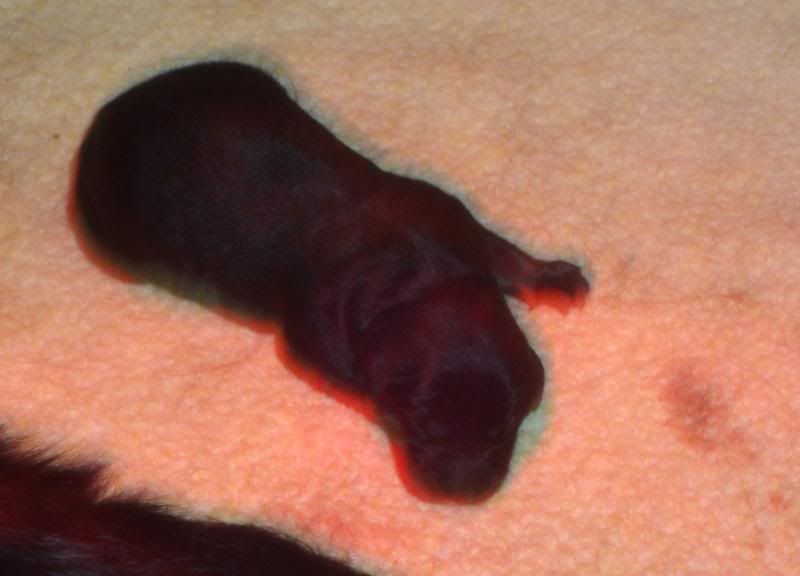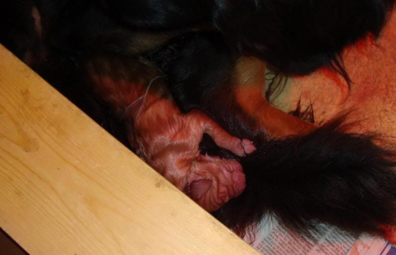 Laat ik even he verhaal oppikken waar ik was gestopt, we zaten dus bij 7 pups, allemaal heel makkelijk en rek-laxed ter wereld gekomen...Onze kersverse mama deed het super en ging na nr. 7 rustig alle kleintjes verzorgen, buikjes likken enz... Wij wachtten rustig af want we vermoeden toch wel dat er nog een pupje zou komen.. Meestal liet Esha er zo'n drie kwartier tot een uur tussen maar nu nam ze wel heel lang de tijd ! ze bleef wel rustig dus wij weten dat een break van zo'n 2 uur dan normaal gezien ook geen kwaad kan...Geen zorgen so far dus.. Maar het werd ondertussen wel steeds later en zo stilaan zagen we toch weer weeënactiviteit(het laatste uur dan)... Het leek wel of de weeën niet zo sterk waren als voorheen, toen moest ze amper een paar keer persen voor een pup maar nu zette het niet echt door..Ondertussen waren we toch al bijna drie uur verder en toen hadden we zoiets van, hier moeten we niet mee wachten...Gelukkig hebben we hier een dierenarts in onze straat, dus die even geraadpleegd en ze vond het ook wel aangewezen om even te komen kijken...Uiteindelijk besloten om een weeën opwekkend middel toe te dienen..Ze bleef nog even kijken en na amper 10 minuten begon Esha terug te persen...Er kwam echter geen pup zoals verwacht maar wel een nageboorte...Volgens de dierenarts kon er nog best wel een pupje opzitten en dus moesten we opnieuw even wachten...Als er een half uur later nog niks was kwam ze terug om nog een inspuiting te geven...Er volgde jammergenoeg niks meer en dus kwam de dierenarts opnieuw...Wij hadden zoiets van, misschien was ze aan het persen op die nageboorte die maar niet kwam en is ze nu echt wel klaar ???of als er nog een pupje zit is er slechts een heel minieme kans dat die nog levend wordt geboren...Dat was ook de mening van onze dierenartse. Ze bleef weer even kijken....