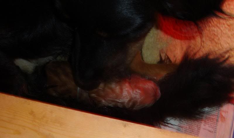 Alles is heerlijk rustig tot ik plots de pups een beetje hoor piepen, ik kijk even om naar de werpkist en zie dat Esha zich opnieuw zit te likken achteraan...En plots floept nummer 9 eruit !!!!nog een wondertje, geboren om 22.40, een prachtig black/tan meisje !!!ik ga snel even Danny roepen die me in eerste instantie niet gelooft maar toch komt kijken om dit met eigen ogen te zien !!!hoe raar kan het lopen !