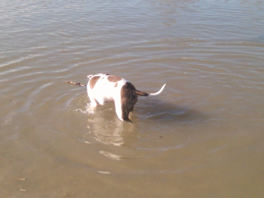 En ja hoor, zodra we daar aan kwamen vond Gino daar een speelkameraadje, een staffie van ook een half jaar oud. Erg leuk gezicht en toen rende Gino zowaar het water in!