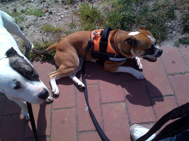 Deze foto stuurt mijn vriend me net toe met zijn telefoon. Hij loopt buiten met de hondjes en terwijl Cheeko stond te plassen gaat Boebie even lekker liggen in het zonnetje hahaha