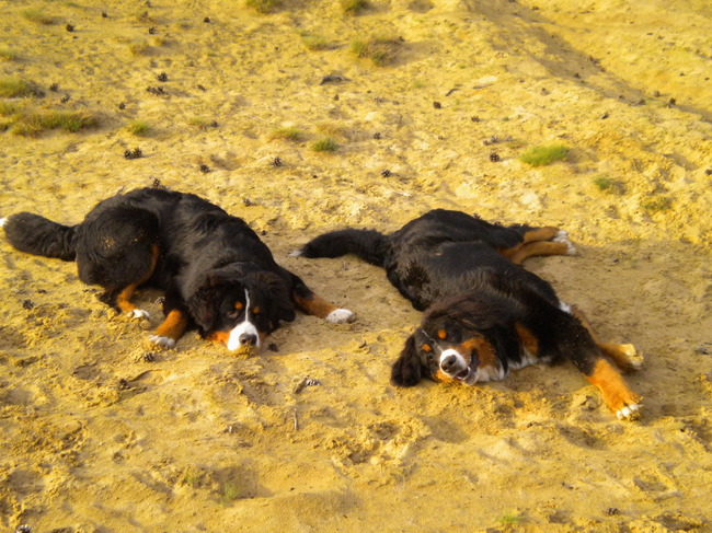 Jihaa, een heerlijk zonnetje, tijd om lekker te rollebollen in het zand ...