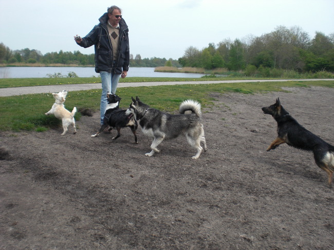 Ja, die hond helemaal rechts hoorde bij die man. Het was HAAR balletje. Het arme beest moest flink haar best doen om het balletje te pakken te krijgen.