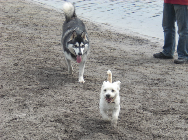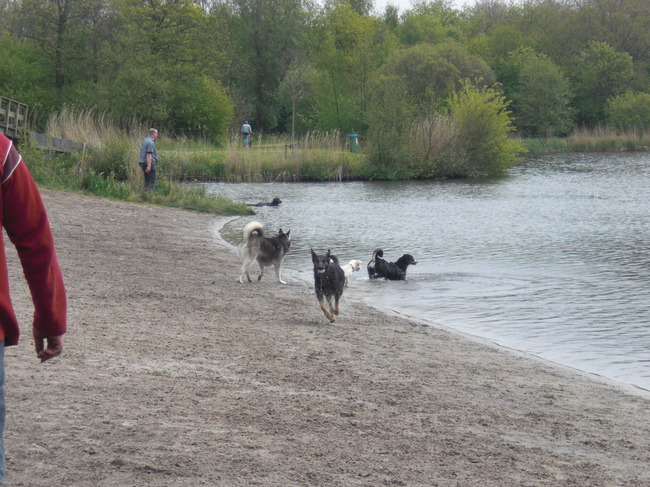 Toen we bij het gedeelte kwamen waar de hondjes los mochten, was het helemaal klaar. Iedereen ging lief snuffelen en spelen en zwemmen en gek doen. Geen wanklank gehoord!!