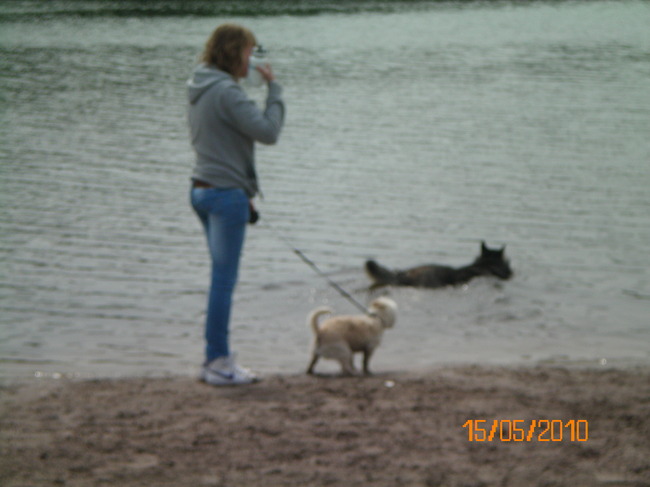 King ging even een klein stukje zwemmen. Benji staat op de kant denk ik weer keihard te blaffen