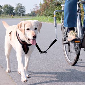 Nou, het idee van deze hulpstukken is natuurlijk dat er een veer aan zit. Deze veer zou juist onverwachte schokken opvangen... Beter dan dat je zelf kan doen als de hond onverwacht zou trekken. Uiteraard moet de lijn niet lang genoeg zijn zodat de hond voor of achter de fiets langs kan.