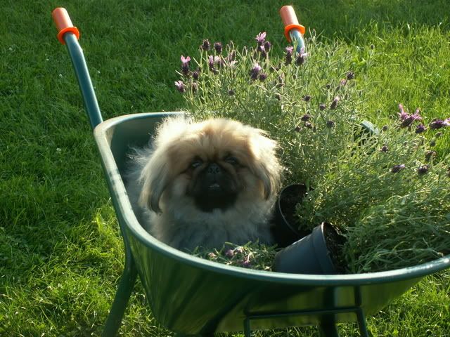 wat is een hond toch zonder putjes graven en plantjes plat drukken in de tuin he hahahahaha....