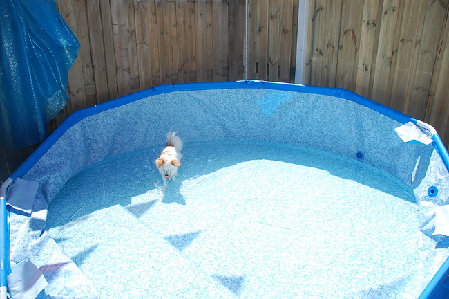 maar voor de honden was het geweldig ,ik had de poten eraf gehaald en er bleef zo'n 15 cm water instaan ,vooral Quincy vermaakte zich prima , vandaag hebben we een nieuw zwembad gehaald en geplaatst ,daar kunnen ze niet zelf inkomen maar als wij er in zijn mogen ze meezwemmen