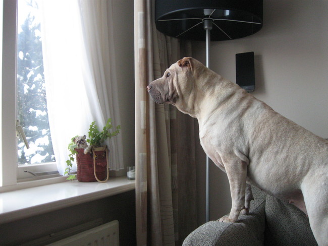 als ik weg ga zit jazzy voor het raam en kijkt me helemaal na.