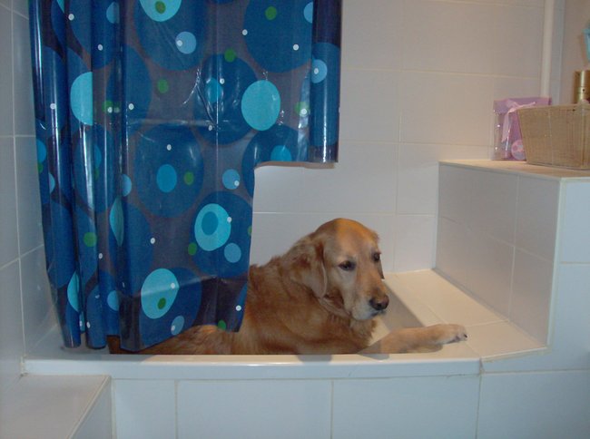 Pfff...wat een dappere hond ben jij zeg! Tjibbe gaat echt niet uit zichzelf de badkamer in!