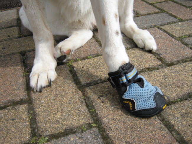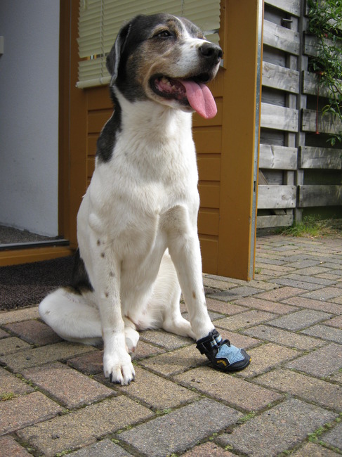 Déru heeft een wondje aan haar voorpoot en kan er bijna niet meer op staan. ZZ Een van haar teentjes is gedeeltelijk geamputeerd en ze loopt met dit teentje op de huid in plaats van op de zool, want die heeft ze aan dat teentje niet!! De huid van de zool verdikt normaalerwijze , maar nu met dit droge weer en veel stof en zand is de huid doorgelopen. Dit doet natuurlijk pijn en ieder korreltje zand of steentje voelt ze. Was op zoek naar een schoentje ! Bij zooplus alleen gevoerde regenlaarsjes! Niet echt geschikt om te dragen bij 30 graden Wie weet nog een winkel op internet!!???