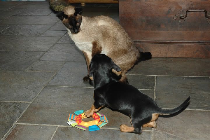 Wij hebben nog een konijntje (Broer) en daar speelt Zoey mee, maar we moeten er goed bijblijven en op letten...konijn blijft een prooidier..