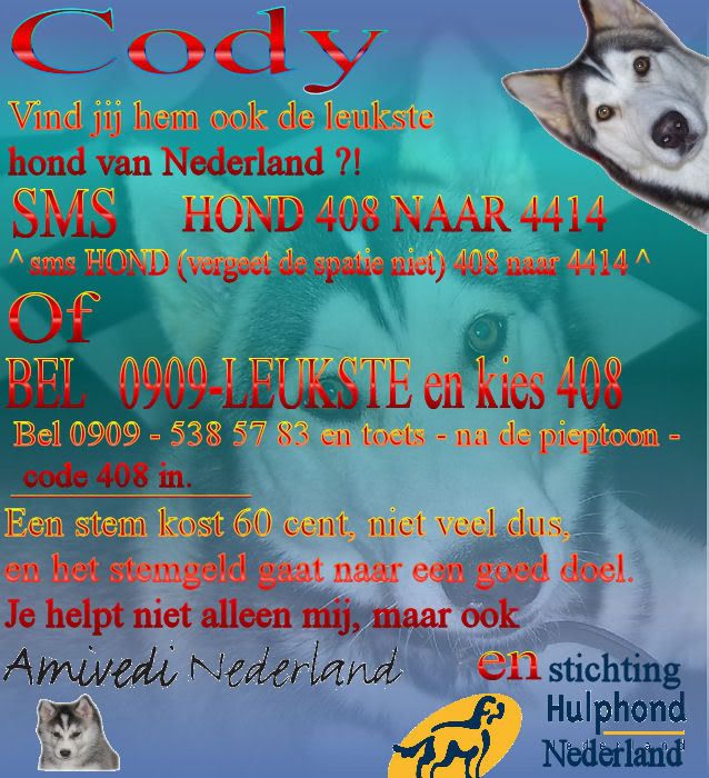hoi hoi, ik doe dit jaar mee aan de leukste hond van nederland verkiezing. zouden jullie op me willen stemmen ? 1 stem kost 60 cent ,niet veel dus , en je helpt er niet alleen mij mee maar ook nog een paar goede doelen ( het stemgeld gaat naar een goed doel ).