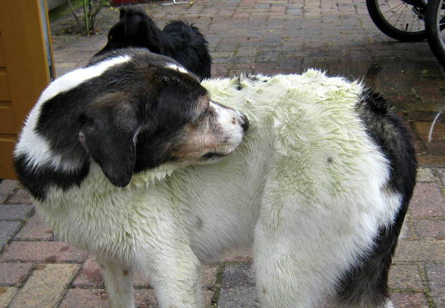 Ik heb me er niet druk om gemaakt, mijn honden lopen er wel vaker als zwijntjes bij. De volgende dag was haar wit gewoon weer wit!