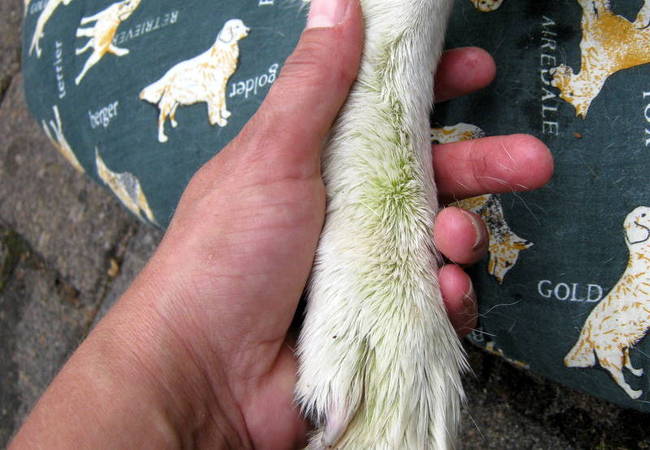 Nu ze opgedroogd is valt het hele groene niet meer zo op, maar wit is anders. Het is net kleurstof wat in de vacht getrokken is.