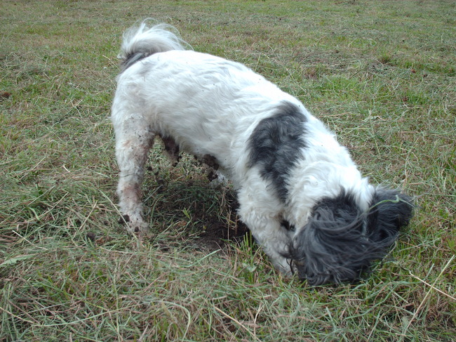 Mijn Witje wil er altijd in rollen in plaats van graven, komt altijd na het gras gemaaid is weer groen thuis!
