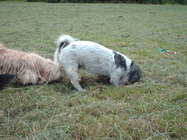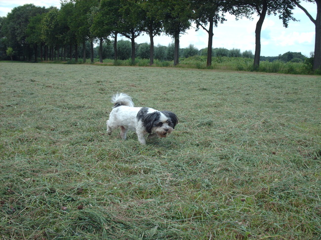 Hier vind Sjenghi het ook heerlijk als het gras gemaaid is en dan voor al als de heerlijke molshopen weer omhoog komen ze zoekt elke dag naar verse ha ha ha .