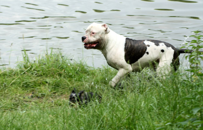 Aan het plaatje te zien heb je een Amerikaanse Stafford?? Die ziet Chihuahua's toch ook niet aan voor speelgoed??