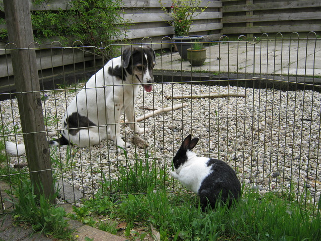 Tegen mij zegt ze, terwijl ze een kleedje op het terras voor me neerlegt ; 'wil jij goed op Jumper passen en bewaken dat er geen poezen of katten in de tuin komen.' Het is namelijk een keer gebeurt dat Jumper, die eigenlijk binnenkonijn is en af en toe buiten mag huppelen, opgejaagd werd door een kat toen wij allemaal binnen lagen te luieren.