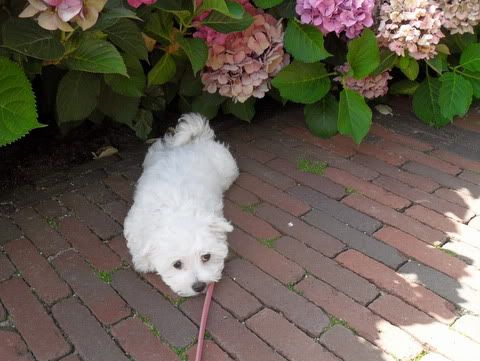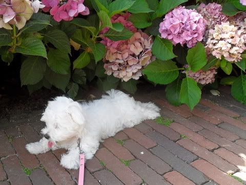 leuk hoe ze altijd met die gestrekte achterpootjes liggen haha mooie foto zo met die hortensia's er achter.