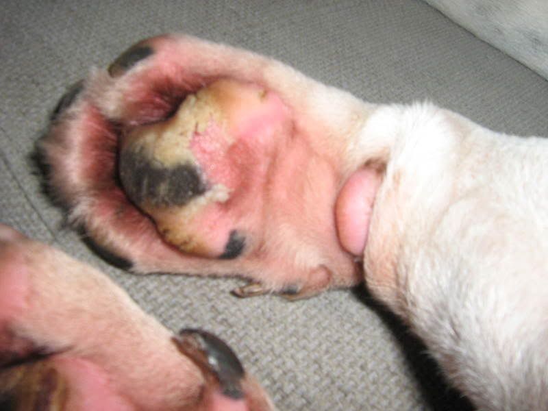 bijde voorpoten de kussentjes eraf,hij kon echt niet meer lopen,en het heeft echt lang geduurt voordat het weer geheelt was,skate had in 1 nacht tijd de kussentjes ,,losgeweekt"!