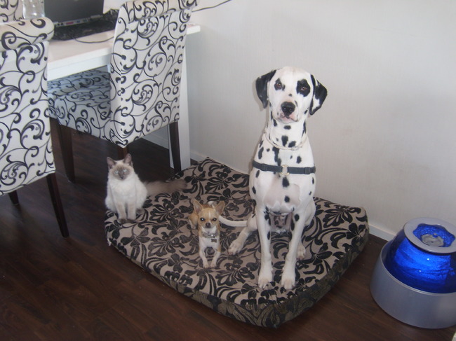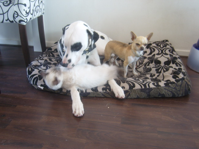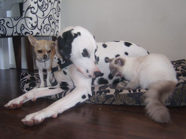 maar de dalmaat was erg bang voor de kat, maar die heeft buiten meerdere malen een tik op zn neus gehad haha omdat ie met 4 poten tegelijk op een vreemde kat sprong, vond ie t nog vreemd ook dat ie een tik kreeg, nu gaat het hier eigenlijk heel goed samen, liggen vaak met zn drieen, tot ik de camera pak, dan gaat de kat ervandoor, de chi staat naast me te springen of ik wat lekkers heb en de dalmaat vind het allemaal allang goed