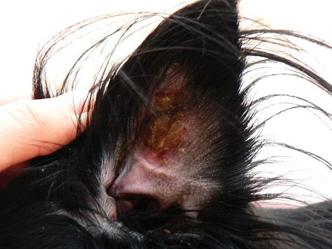 Heeft blaren aan de binnen kant van zijn oorschelp.
