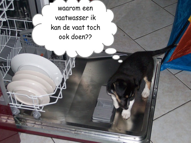 een vriendin van mij was gewend dat penot zich altijd met de afwas 'bemoeide'dus ging de klep dicht. Toen ze daarna Kaatje kreeg bleek dat ka zoiets engs nooit zou durven! Dus rammelt en maakt geluid, er is geen voorzichtiger hondje als Ka. Afijn de klep weer open. Komt Pip langs. Ka en Pip lekker samen een het keten. en wij de markt over. Wat denk je dat we vinden bij terugkomst? Ja Pip durft wel hoor