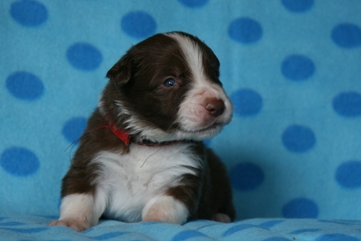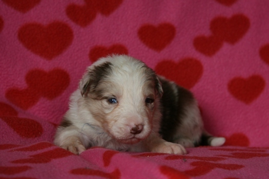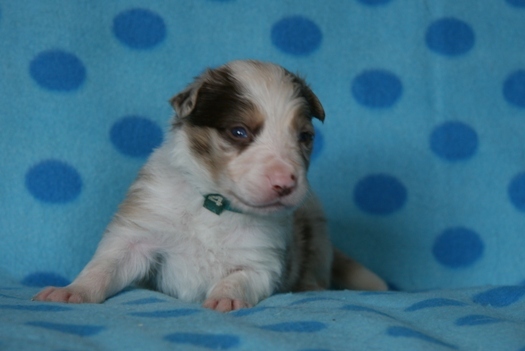 De kleur van red-merle is soms niet evident om te zien als ze nog zo jong zijn. Het kan nog altijd evolueren. Meadow was red-merle zonder de derde kleur toen ze een pups was maar ondertussen is ze red-merle tri geworden. Als je de ourderhonden ziet kan je ook zien of de pups tri kunnen worden.