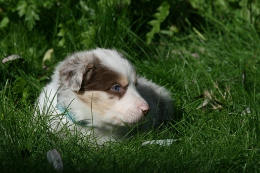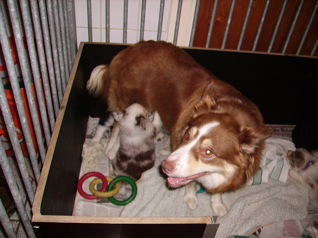 Er zijn nu nog twee pups over (een zwart-witte teef en een chocolade-merle reu) Dus.... hahaha