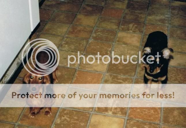 Toen ik thuis woonde had ik een Franse Basset, die ik helaas niet mee kon nemen toen ik op mij zelf ging wonen. Denise kon niet alleen thuis zijn en ik moest toen nog naar school....Toen ik mijn eigen huisje had, kwam Flos in ons leven die nu alweer 15 jaar is. Na 5 maanden kreeg Flos er een maatje bij en dit was Buster. Hij is helaas in augustus 2007 overleden...Hieronder nog een foto van het prille begin van die Flos samen met Buster...