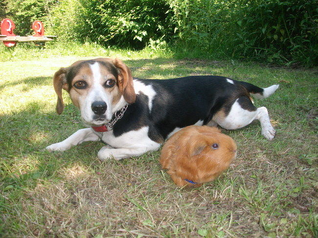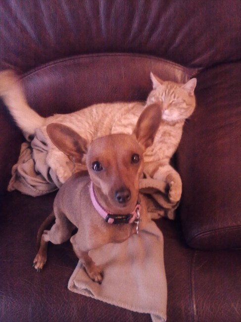dit is een foto van roxy en skinny als er een kat aan komt lopen, vervolgens gaat roxy er op af en beschermt skinny