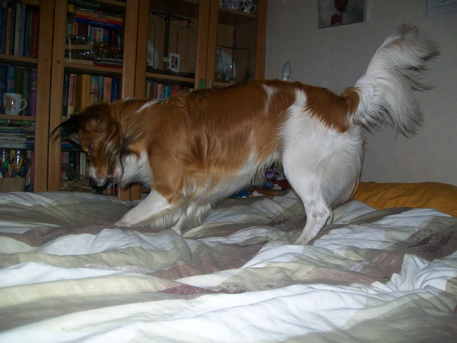 Ze was (toen ik niet thuis was) op de bank gaan liggen, en ja ook op de afstandbediening, dus madammeke lag TV te kijken ,toen ik thuis kwam. Wel n verantwoorde zender hoor. Gewoon nederland 1. Een andere keer had ze haar dierenpaspoort in haar mand gelegd,haha. En ja ook een gekkigheidje: ondergoed eten!