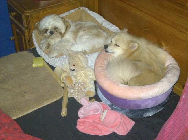 De Shelties slapen echter wel op de grond. Abby was als pup nogal moeilijk zindelijk te krijgen dus die heb ik nooit op bed gewild vanwege dit en Eevee haar dochter heb ik gewoon eigenlijk ook zo opgevoed dat ze het niet doet. Ze komen wel eens op bed... Maar als ik ga slapen wil ik de ruimte dus dan gaan ze hun mand in/kussen of stoel op.
