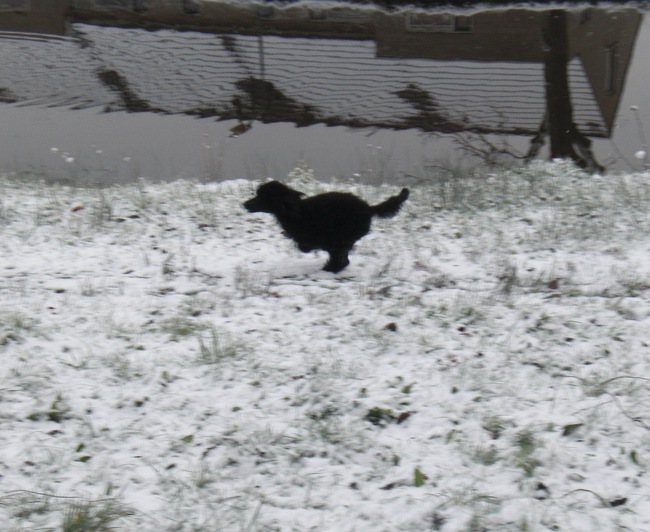 Hier heeft het vanmorgen ongeveer 10 minuutjes gesneeuwd. Het blijft niet liggen, maar ik was idd ook erg benieuwd hoe Billie Jean erop zou reageren.. Dus wij naar buiten, nou, die sneeuwvlokjes interesseerde hem totaal niet... Maar t vrouwtje vond het wel echt superleuk hoor ^_^! Word altijd helemaal vrolijk van sneeuw, als ik vrij ben tenminste:-P!