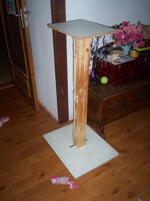 bij de ikea heb je van die lack tafeltjes van 5 euro, daar kan zo'n paal prima op staan lijkt me. je hebt ze in veel verschillende kleuren en het kost dus maar 5 euro........ dat lijkt me voor iedereen rustiger.