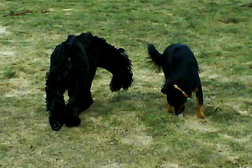 Ontmoeting tussen Lola en een zelfverzekerde hond die ze een beetje eng vind maar wel kent...haren hoog van de spanning en een mooi boogje en wegdraaien. Daarna volgt meestal even snuffelen en de weg wordt door beide dames vervolgd.
