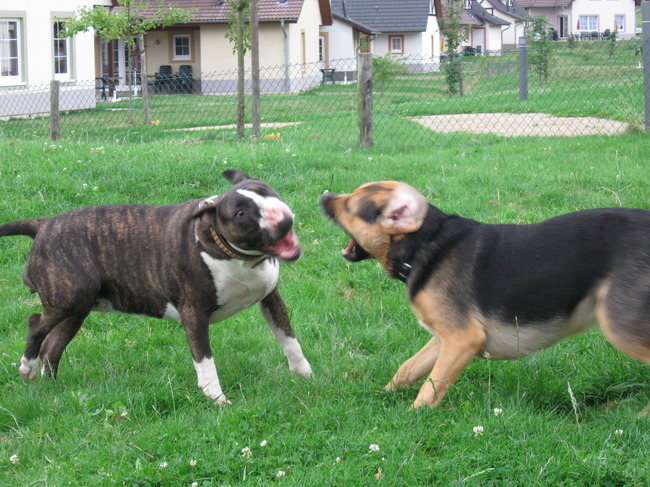 Ik heb wel een foto van Mexx en een waterbak met een andere hond erbij en ontblote tanden, zie mijn foto's op het profiel
