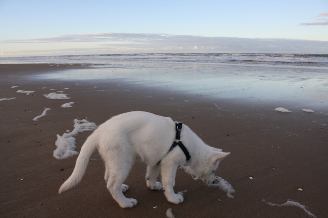 Vanochtend vroeg (lees: half 9, dat vond vriendlief leuk) zijn wij in de auto gesprongen naar het strand in Bloemendaal, Aiko voor het eerst naar zee en hij vond het geweldig, alleen die golven vond ie nog wat spannend dus het water is hij niet ingegaan