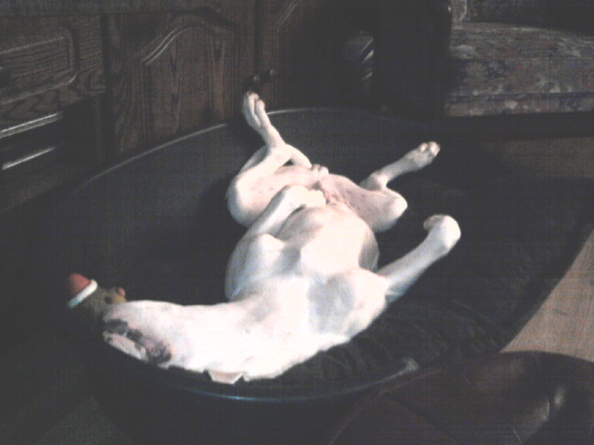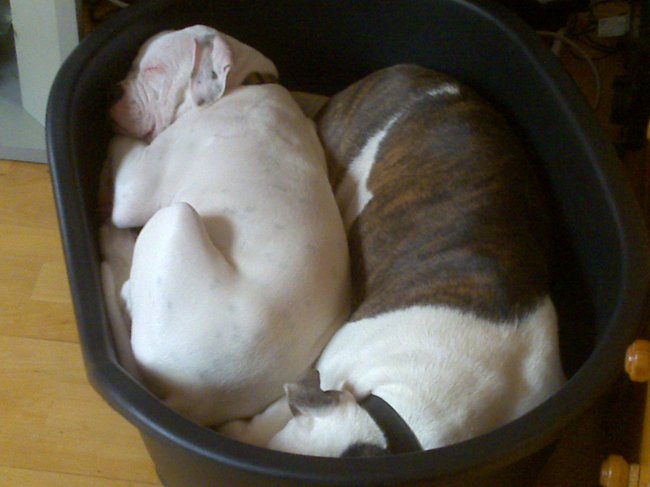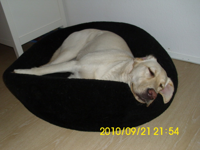 Die van ons kan ook zo heerlijk slapen als jouw hond! haha geweldig! Op zijn rug, op zijn zij, half onder de tafel, tussen de mand en het gordijn..half van zijn mand ga zo maar door!