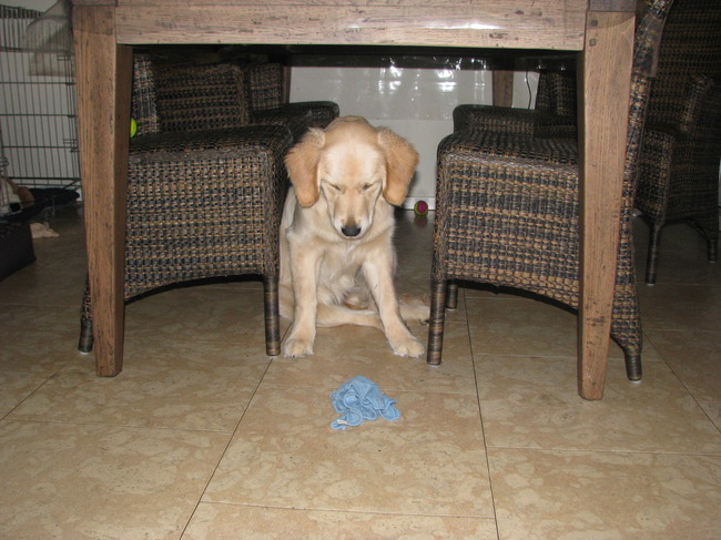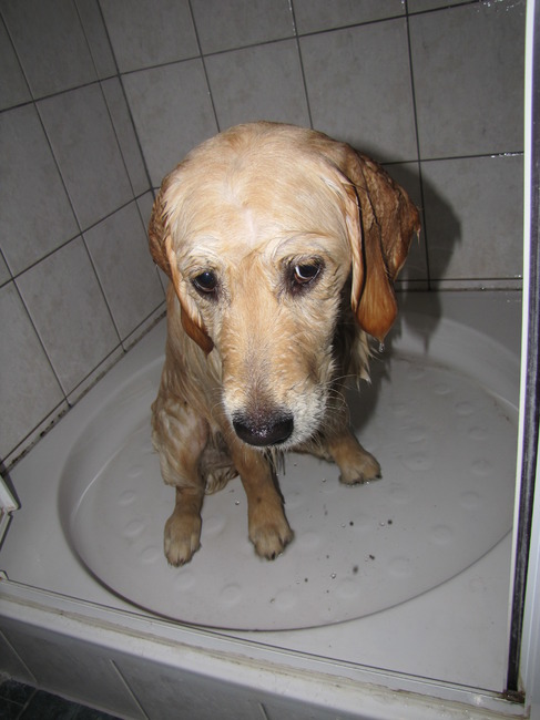 Kijk nu hoe zielig ik ben, omdat ik volgens mijn vrouwtje niet meer blond was, moest ik onder de douche.