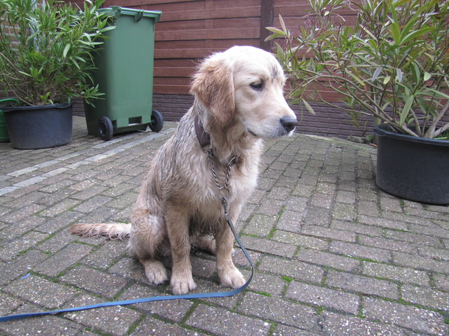 Lekker je baasje vervelen, heerlijk spelen met Wolfje, lekker vies worden, en tsja... Dan moet je ook maar onder de douche!! Nee joh, modder is goed voor de huid, dus lekker blijven rollen door die rommel hoor!!!