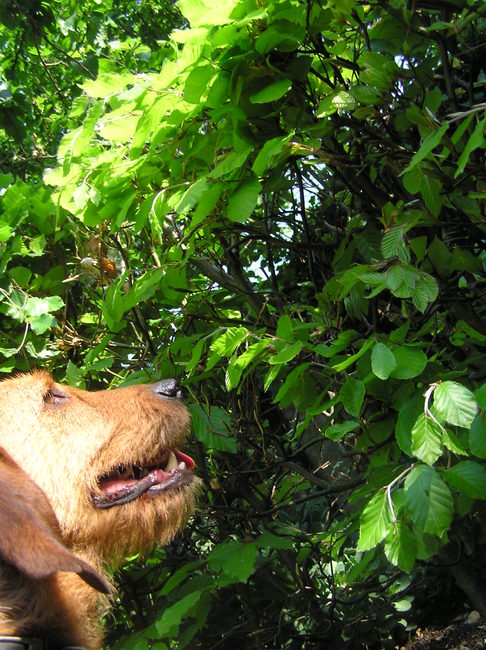 Meneer zat helemaal tussen de planten bij het hek naar de tuin van de buren te gluren met zn oortjes gespitst