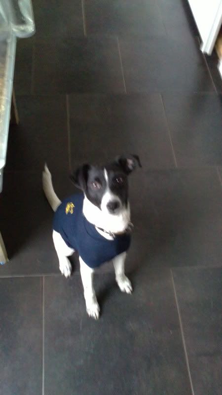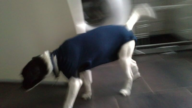 Nou Odie,hij staat je beter als bij mij,ik Rowan had een,baby"romper, nou had hem snachts al uitgetrokken,En m'n ,,nicht"een malamute, die was toen ontsnapt uit huis ,en was achter een schapenkar aangelopen, met haar grotehondenromper, dat kwam hun baas duur te staan,Beterschap hoor Odie