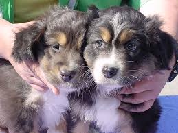 Hierboven zie je een Gewone Black Tri Aussie pup (rechts) en een Dilute Black tri pup (links)