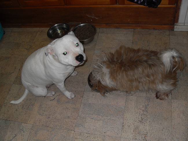 zal zo wel eens foos laten zien. zit ze netjes voor de bak te wachten haar bak en gizmo smult erven en daarna gaat ze samen met hem eten. hahha myriam