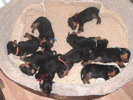 En het nest van onze Eevee, hier geboren (Abby is haar moeder) bestond uit 7 pupjes, 3 teefjes en 4 reutjes maar helaas heeft een teefje het niet gered (een bijzonder gekleurd blue merle pupje en voor de rest allen driekleur, Eevee is de pup links op de foto)...